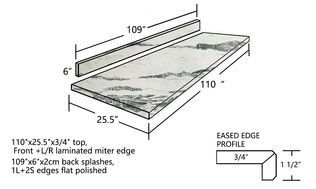 109"x6"x3/4" back splashes, 1L+2S edges flat polished