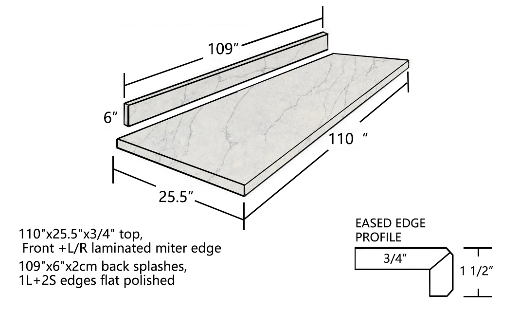 110"x25.5"x3/4" top, Front +L/R laminated miter edge